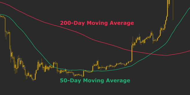 MA50 đại diện cho sức khỏe trung hạn, MA200 là bức tranh dài hạn. Khi chuỗi nến tăng kéo MA50 dốc lên, cuối cùng sẽ có thời điểm đường 50 kỳ băng qua đường 200 kỳ và ở phía trên trong một thời gian. Bạn có thể chọn SMA hay EMA tùy phong cách: SMA mượt hơn, ít nhiễu hơn; EMA nhạy hơn, báo sớm hơn nhưng dễ “giả” hơn. So sánh hai họ xem thêm ở SMA và EMA.
