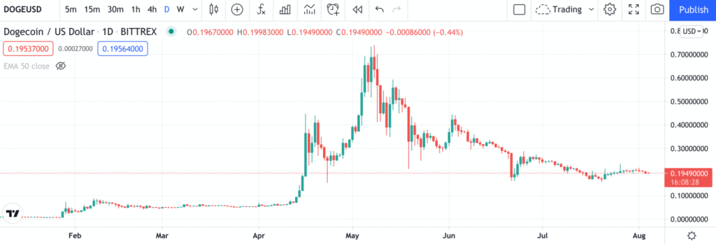 Năm 2021, Dogecoin bùng nổ khỏi “vùng meme” để leo thẳng lên mặt báo: từ hiệu ứng Reddit, những cú tweet của người nổi tiếng cho đến thời khắc SNL của Elon Musk. Chỉ trong các mốc đầu năm 2021, DOGE nhiều lần lập đỉnh mới, trở thành cái tên được nhắc dày đặc khi nói về “meme finance”. Vào ngày 14–16/4/2021 DOGE vượt 0,10 USD rồi 0,45 USD; tháng 5/2021 biến động mạnh quanh sự kiện SNL.