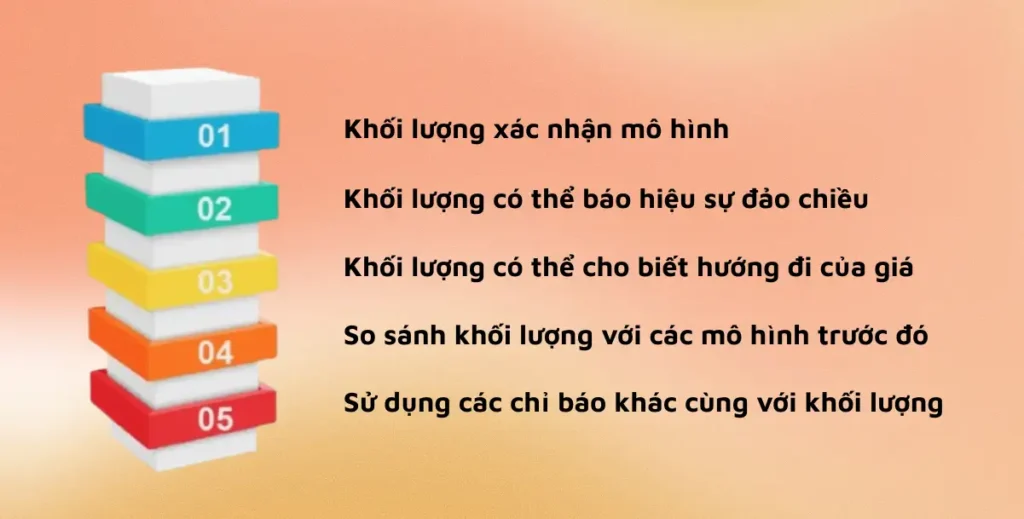 Khối lượng nên tăng cùng hướng chủ đạo: trong uptrend, những ngày tăng giá nên đi kèm volume lớn, còn nhịp điều chỉnh giảm có volume co lại; ngược lại cho downtrend. Khi giá đi tiếp mà khối lượng suy yếu dần, rủi ro sẽ tăng lên. Đọc thêm về cách dùng volume đúng cách tại khối lượng giao dịch.