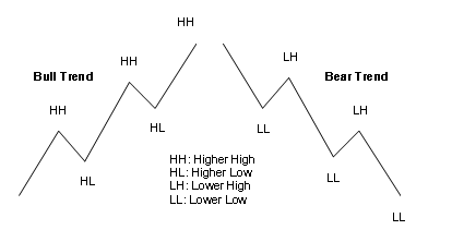 Trong xu hướng tăng, giá tạo đỉnh cao hơn (HH) và đáy cao hơn (HL); xu hướng giảm tạo đỉnh thấp hơn (LH) và đáy thấp hơn (LL). Lý thuyết Dow yêu cầu tín hiệu xác nhận: chỉ khi đỉnh/đáy mới vượt qua mốc quan trọng trước đó, xu hướng mới được coi là sẽ xảy ra dài hạn. Nếu bạn cần sơ đồ ký hiệu cho cấu trúc này, hãy tham khảo bảng viết tắt tại HH/HL/LH/LL và các biến thể.