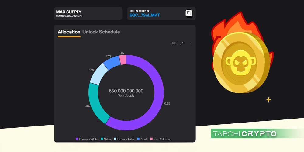 MonkeySmart có tên token là MKT được thiết kế với một mô hình phân phối rõ ràng và do cộng đồng điều khiển. Với tổng cung tối đa là 650.000.000.000 MKT, cơ chế tokenomics đảm bảo giá trị được phân bổ hợp lý vào các khu vực quan trọng để thúc đẩy sự phát triển, phần thưởng và sự tham gia lâu dài.