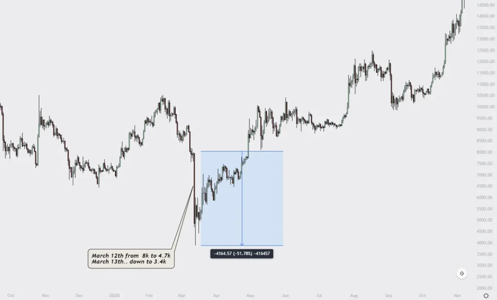 Sự kiện này là minh họa kinh điển của panic sell hệ thống. Khi dịch bệnh bùng phát và mọi thị trường tài chính toàn cầu cùng hoảng loạn, crypto chịu cú sốc kép: tin tức xấu và thanh khoản rút đi. Kết quả là giá lao dốc trong vài giờ, khối lượng bùng nổ, funding đảo pha dữ dội, OI co rút vì thanh lý đòn bẩy. Bài học rút ra: trong những sự kiện vĩ mô cực đoan, tín hiệu kỹ thuật đơn lẻ không còn đủ; quản trị rủi ro phải đi trước.
