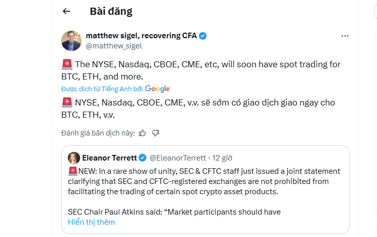 Matthew Sigel, Giám đốc nghiên cứu tài sản kỹ thuật số tại VanEck, nhận định sự rõ ràng về quy định sẽ mở đường để Phố Wall tham gia trực tiếp vào thị trường crypto giao ngay. “NYSE, Nasdaq, CBOE, CME… sẽ sớm có giao dịch giao ngay cho BTC, ETH và nhiều đồng tiền khác,” ông viết trên X.